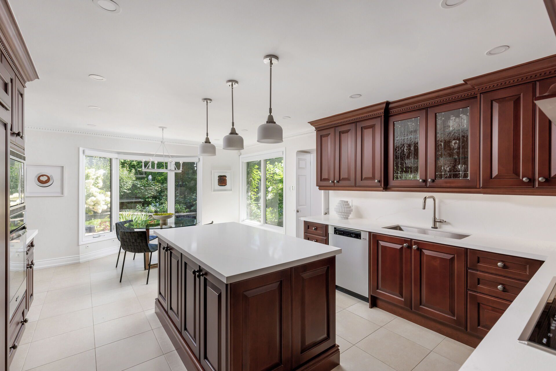 The masterful Chef’s kitchen, by Cameo is every cook’s dream. The attention to detail that went into the design of the kitchen addresses every convenience, making it perfect for preparing family meals with ease or hosting guests. The kitchen features a large centre island, quartz counter tops, premium built-in appliances (36” Wolf cooktop, 36” Wolf oven, Miele dishwasher, 36” GE Monogram fridge, 36” GE Monogram freezer with icemaker), a generous sized pantry, many built-in features, undermount lighting, and a large 30” sink with Brizo faucet and garburator. You will enjoy waking up to breakfast in the sun filled eat-in area, surrounded with stunning garden views from the tall bay windows. Just press one button and all your kitchen shades will open and let in the morning sunlight. With seating for eight, the eat-in kitchen has plenty of room for family and friends. From the kitchen you can walk out to your private backyard oasis for some R&R, a family barbecue or entertaining guests. If you forgot anything, no issues, it’s one convenient, easy step from the backyard patio to the kitchen! The blackberries, fresh herbs and salad greens from the raised garden are always a natural favourite.