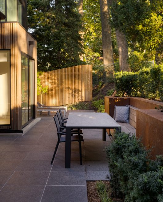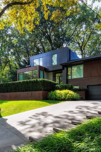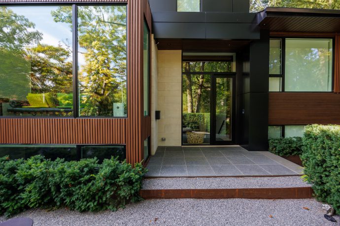 Looking out the floor-to-ceiling Pella windows, you will relish the privacy afforded by the mature trees surrounding the property, including four gorgeous Serbian Pines at the road. Inside, you will find crisp white walls, architectural light features throughout, a secondary kitchen designed for use when entertaining, and no detail spared when it comes to added luxury. The home features sophisticated Gaggenau appliances, Brizo plumbing fixtures, and three completely independent climate zones throughout.