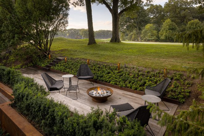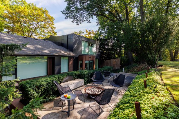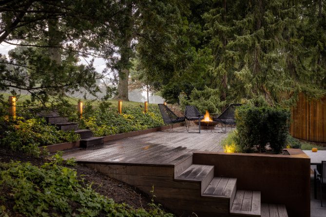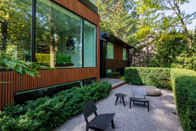 The home is book-ended by two custom privacy walls, and the rear yard has been completely redesigned with two levels. The first of which features granite stone and planting, while the second level is supported by Thermawood planking, a beautiful fire pit, and stairs providing access and stunning views of St. George’s Golf Course located behind the home.