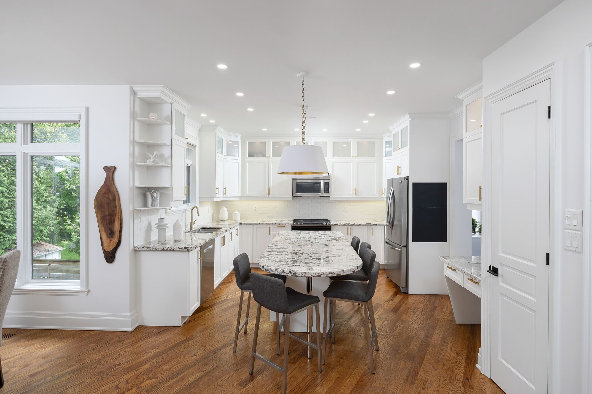 Inside, a semi-open concept floor plan offers the best of all worlds: an ideal space for connections and entertainment with a touch of privacy. A fully equipped, contemporary kitchen will make even a non-chef gasp with delight. Just think: counterspace that goes on for miles plus a kitchen island, along with ample cupboard and drawer space.