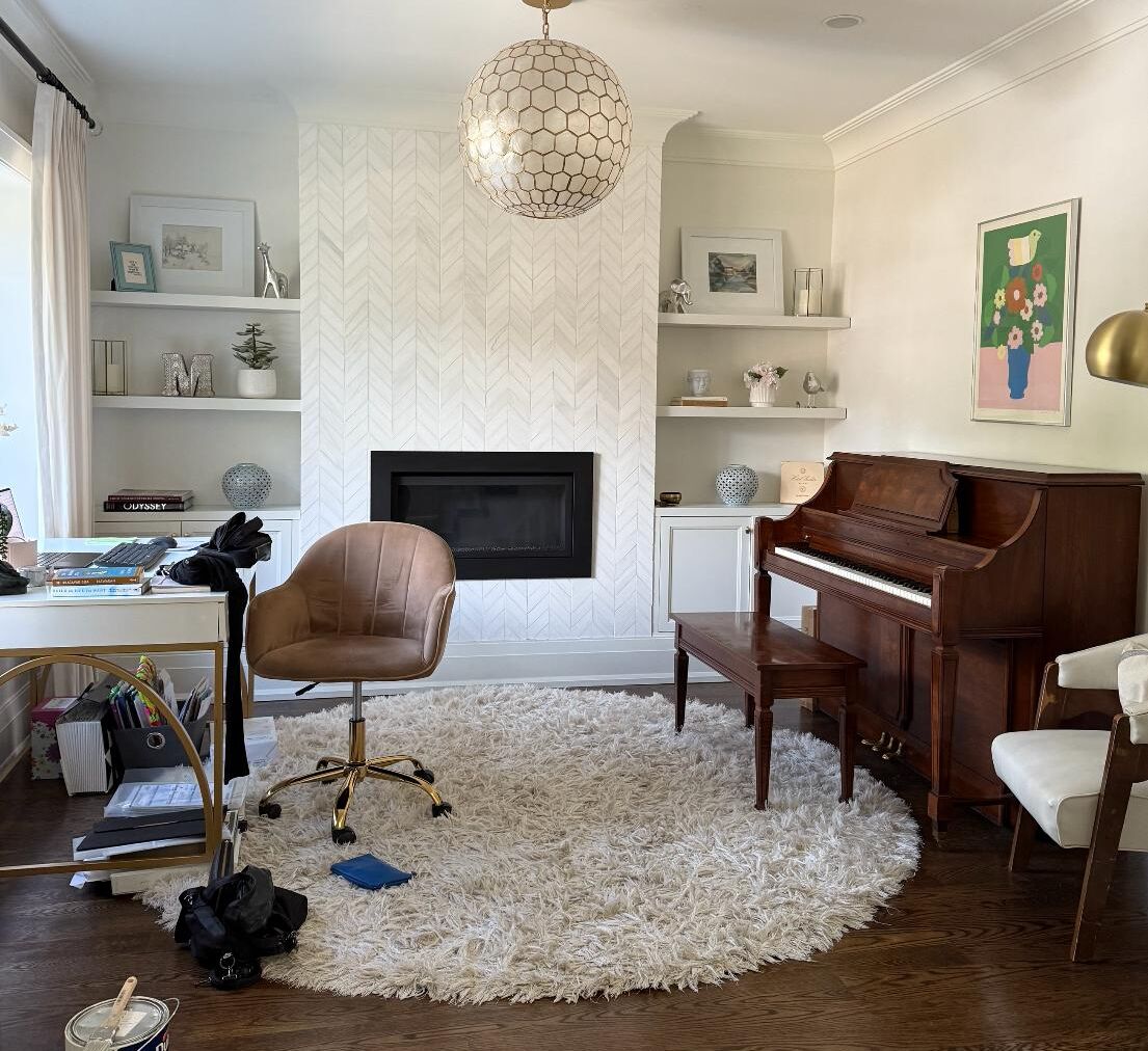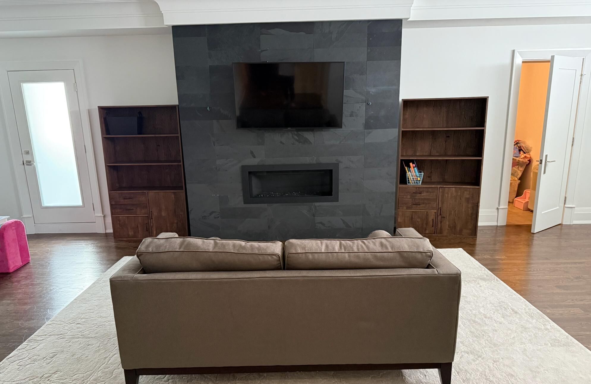 - Marble herringbone backsplash in kitchen + larger format tiles in living room